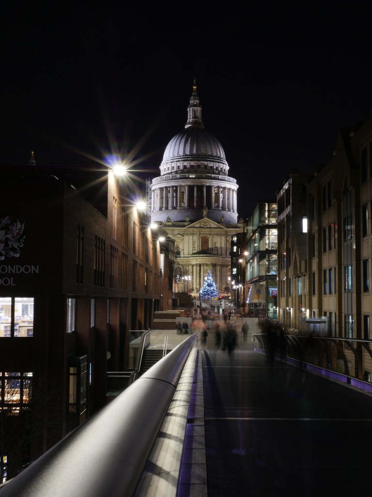 Another favourite is to set up the camera on a tripod on the Millennium Bridge and capture the ghostly apparitions of people walking across toward St Paul’s Cathedral. It’s because of having to use a slow shutter speed that the moving people are caught in this way.