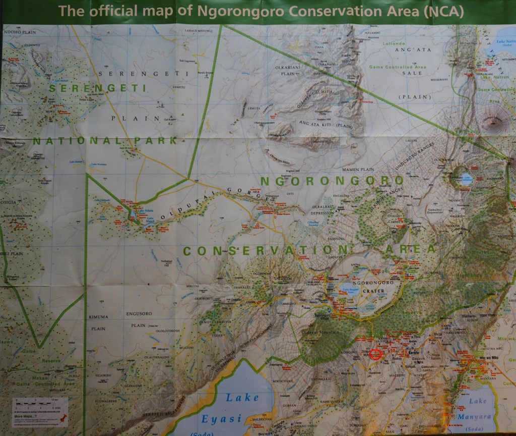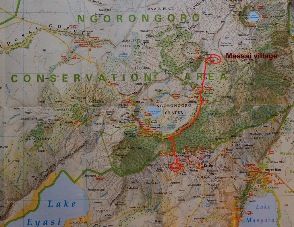 The Ngorongoro National Park. The area circled in red just below the crater is where we were staying. Our room at the Ngorongoro Farmhouse Lodge. The route from the lodge up round, skirting the south east side of the crater to the Massai village.Massai villagers with their cattle.A Massai woman.Massai child.