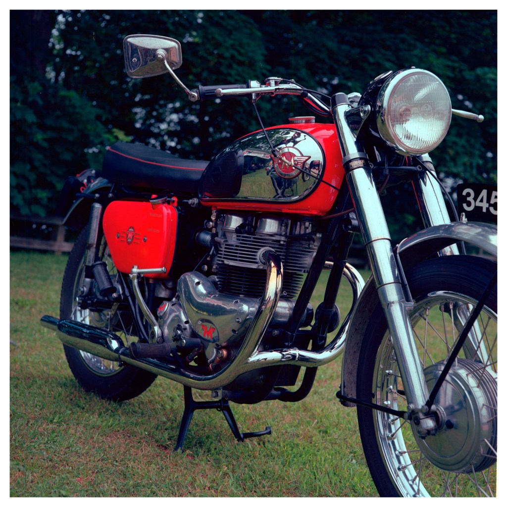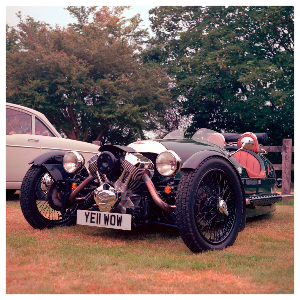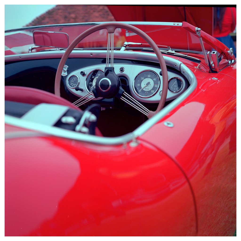 I had anticipated there being a few old vintage cars around at the event and had thoughts of trying to get some close up views of the colourful cars. With the Mamiya TLR you have to allow for parralax error because the image taking lens is below the viewing lens. When you get up close the image taken isn’t quite the same as that which you are viewing. The Mamiya C330 gets round that by having a line move down the viewfinder showing the top of the image that is captured. It seems to work very well as I got the shots I was after.