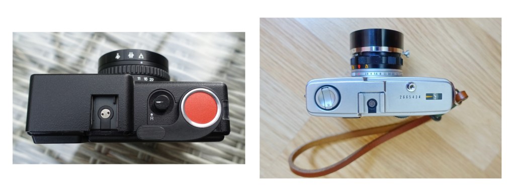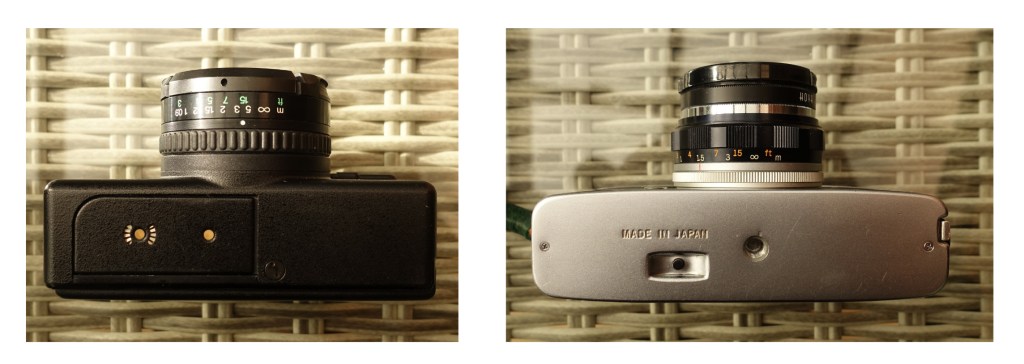 Both of these cameras are of a similar size and sit well in the hand. Both use 35mm film and are of a viewfinder style with fixed 40mm lenses. They both have zone focusing with another scale under the lens showing feet and meter focusing scales for more accurate setting of focus.